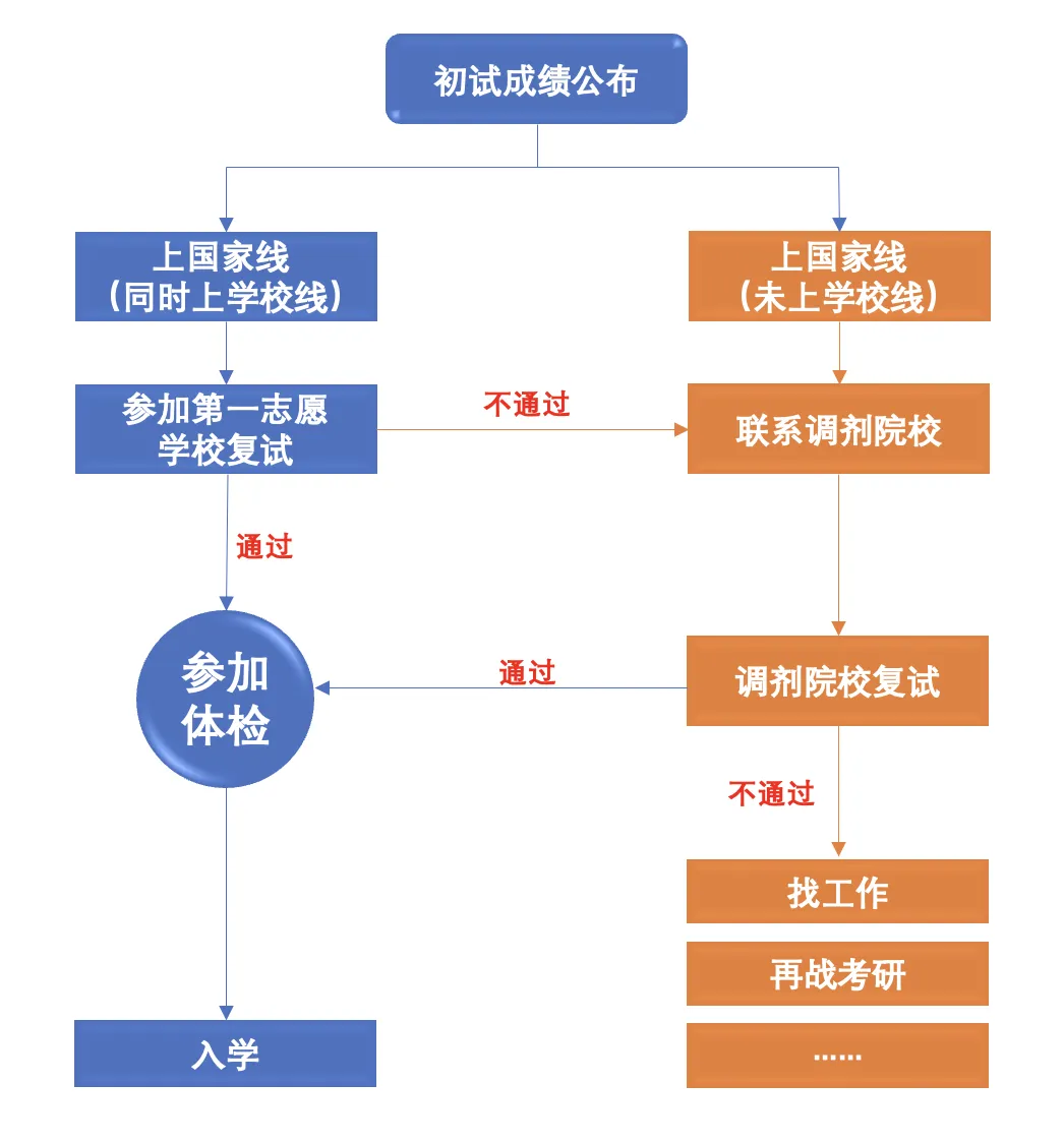 📌 成绩公布后,有些学校会公布排名,那么按照往年复试差额比和招生计划人数(在去年复试通知中可以找到)计算,看自己能否进入复试;📌 没有排名的,对比近三年复试分数线,看自己位置:稳进复试、擦边不保险需两手准备、无缘第一志愿复试但稳过国家线全心调剂。📌 1、如果按照排名或者往年复试分数线自己稳进复试,事不宜迟,尽快着手准备复试。毕竟现在复试成绩具有“一票否决”,复试不过哪怕初试分数再高也不予录取。所以你必须要重视,往年那些高分400+复试被刷就是血淋淋的例子。况且留给大家准备的时间不多,要复习的内容却很多,所以你必须尽快进入状态。📌 2、如果按照排名或者对比往年复试分数线,擦边或者在分数线边缘,建议做好两手准备,一边准备复试,一边搜集调剂信息📌 3、过一志愿院校的校线但没过专业线,首选校内调剂,提前了解报考院校相同或相近专业的调剂缺额情况(其他院系),可向学校招办咨询,也可以查找去年的调剂信息作为参考。📌 4、没有校内调剂机会的同学近期可以查找其他院校的调剂信息,今年的以及往年调剂信息作为参考并整理,必要时可以提前联系咨询。比如目前已经有的调剂信息,有意向的同学等成绩公布后就可以联系申请递交简历,毛遂自荐。