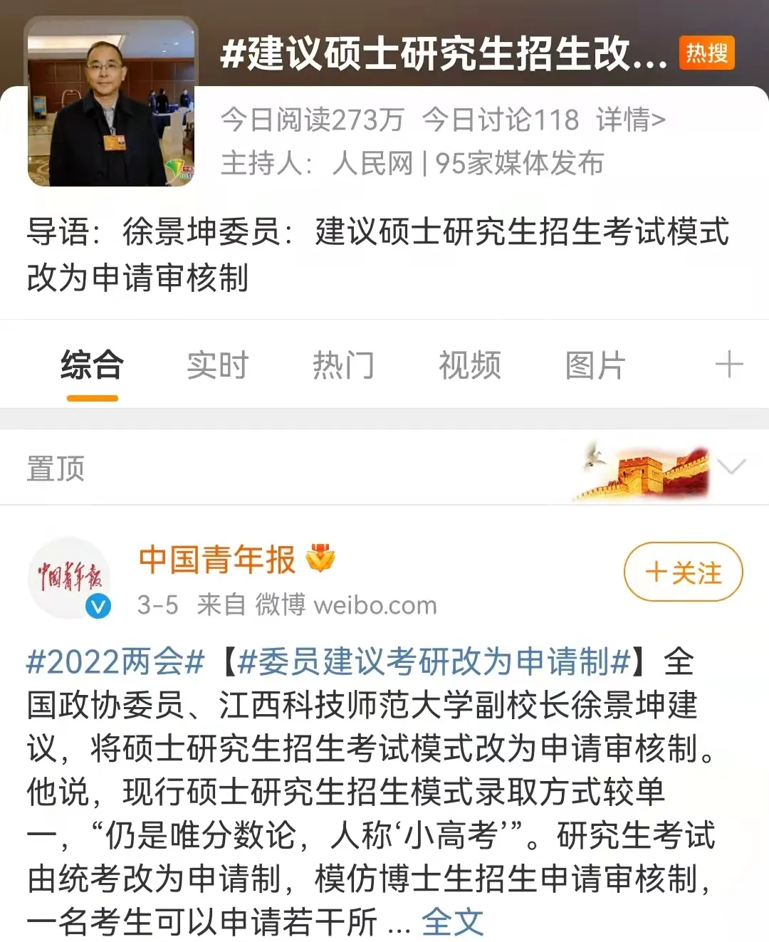 今年两会期间,全国政协委员、民革江西省委会副主委、江西科技师范大学副校长徐景坤建议将硕士研究生招生考试模式改为申请审核制。
