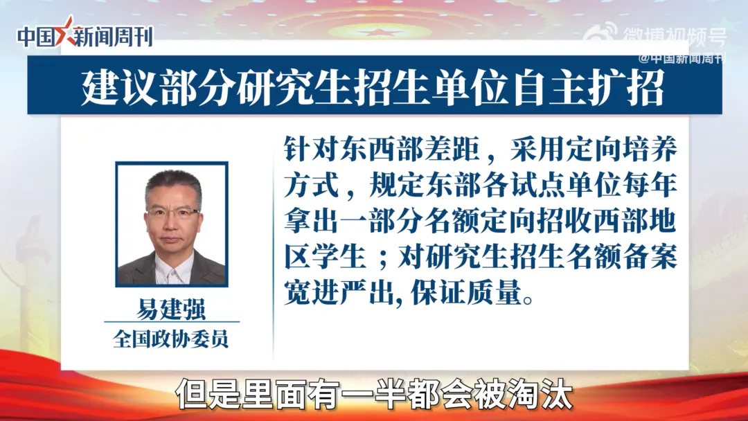 易建强建议,选择研究生培养质量好的单位作为自主扩招试点,合理设置每位导师每年招生计划;针对东西部差距,采用定向培养方式,规定东部各试点单位每年拿出一部分名额定向招收西部地区学生;对研究生招生名额备案,宽进严出,保证质量。