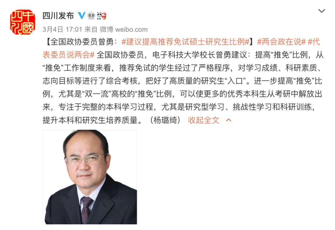 全国政协委员,电子科技大学校长曾勇建议:进一步提高“推免”比例,尤其是“双一流”高校的“推免”比例,可以使更多的优秀本科生从考研中解放出来,专注于完整的本科学习过程,尤其是研究型学习、挑战性学习和科研训练,提升本科和研究生培养质量。