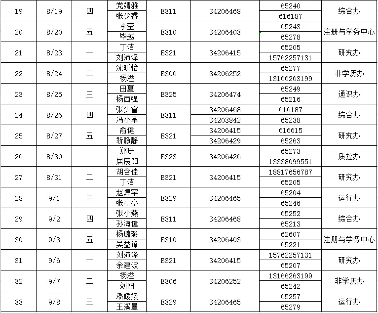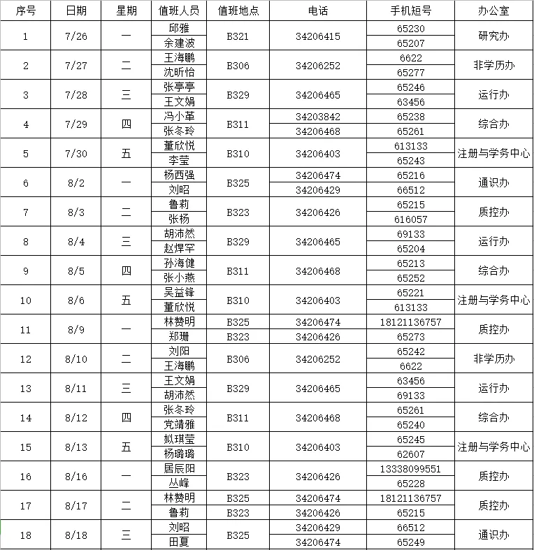 为方便全校师生暑假期间办理相关业务,现将教务处2021年暑假期间值班工作安排如下: