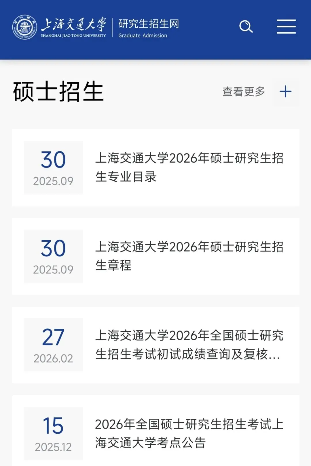 上海交通大学关于招收研究生的所有通知都会放在这个网站上,像招生简章、报名、录取情况、调剂信息等都会在这个网站上通知。
