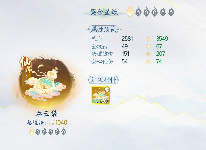 全新仙品秘宝【吞云袋】属性:全攻击、会心化伤、气血、物理防御