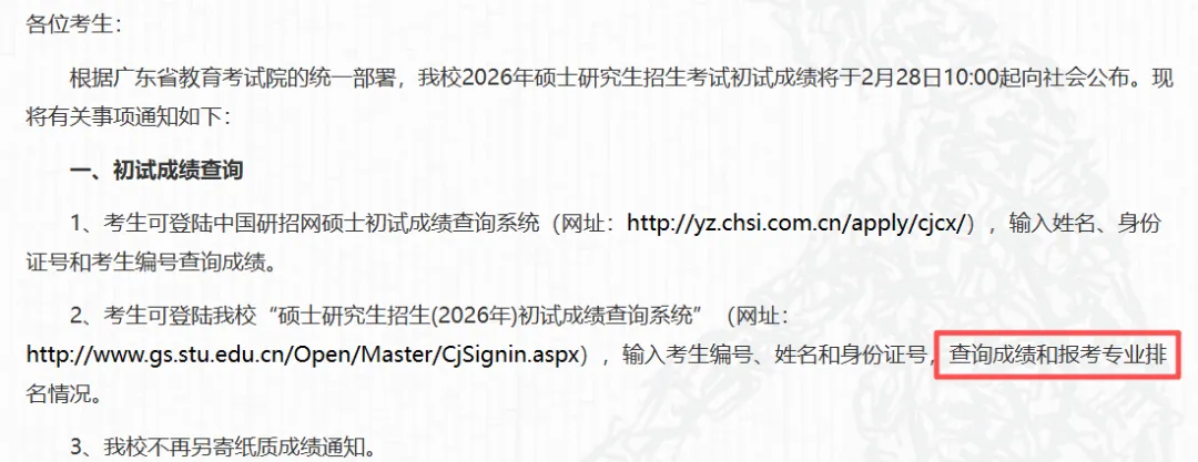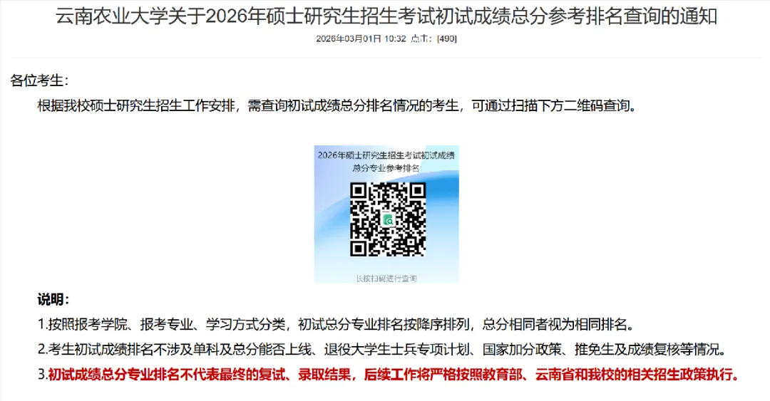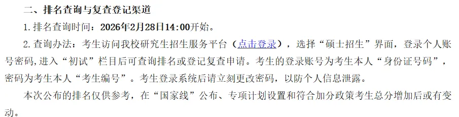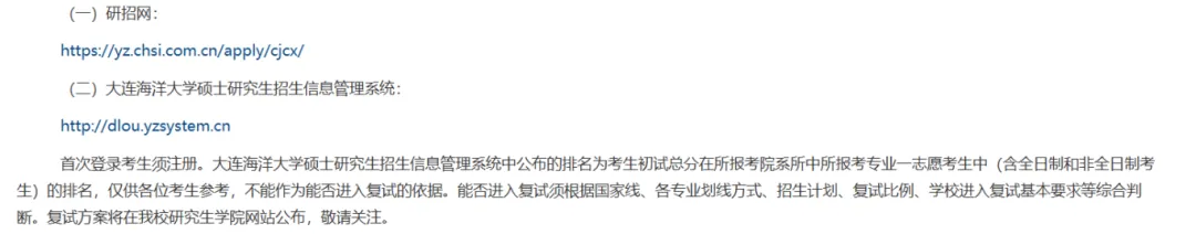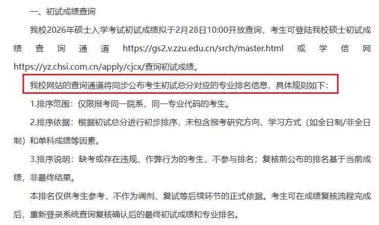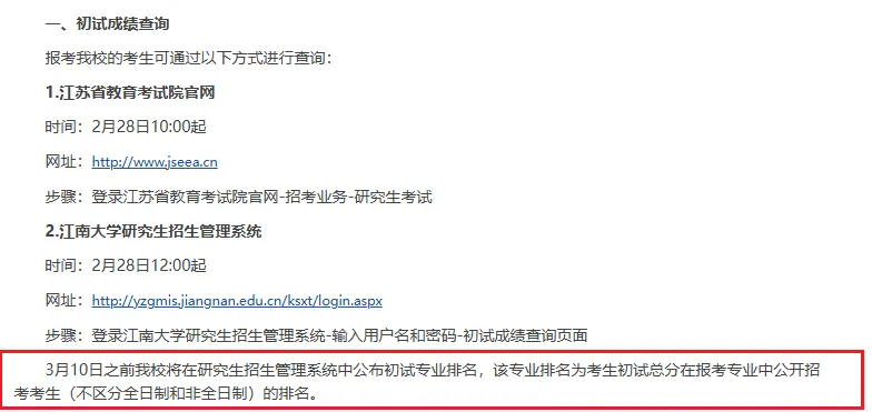 3月10日之前我校将在研究生招生管理系统中公布初试专业排名,该专业排名为考生初试总分在报考专业中公开招考考生(不区分全日制和非全日制)的排名。