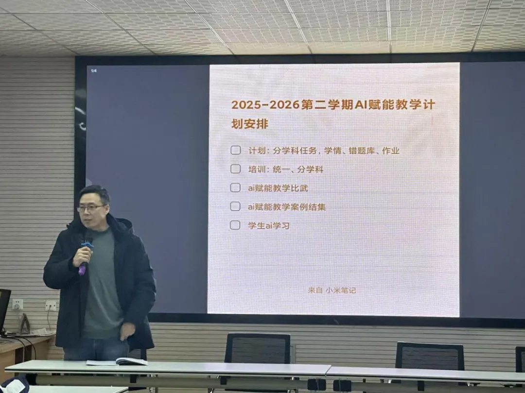 贾小椿副校长对本次会议进行总结讲话,充分肯定各备课组、教研组过去一年的工作成效,同时结合新学期教育教学新形势、新要求,对全体备课组长、教研组长提出新期望,希望各位组长切实发挥引领带头作用,凝心聚力、真抓实干,以扎实的教研工作推动课堂教学质量稳步提升。会议最后,学校特邀校外专业人员开展 “AI 智能批阅作业” 专题培训,讲师围绕操作方法、应用技巧、实际优势等内容细致讲解并进行实操演示,让参会教师直观感受 AI 技术在作业批改、学情分析中的便捷性与高效性,为新学期运用 AI 技术减负增效、精准教学奠定基础。