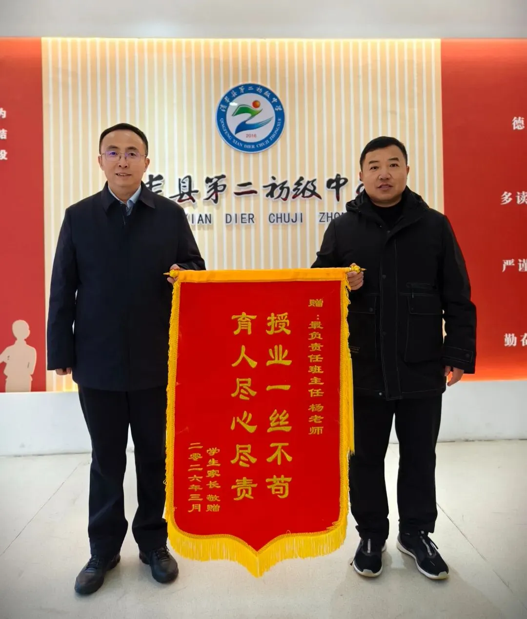 这份默默的付出,不仅让学生们收获了知识与成长,更深深感动了每一位家长。近日,学生家长代表专程来到学校,将一面写有“授业一丝不苟,育人尽心尽责”的锦旗送到杨主任手中,用最质朴的方式表达最真挚的谢意。