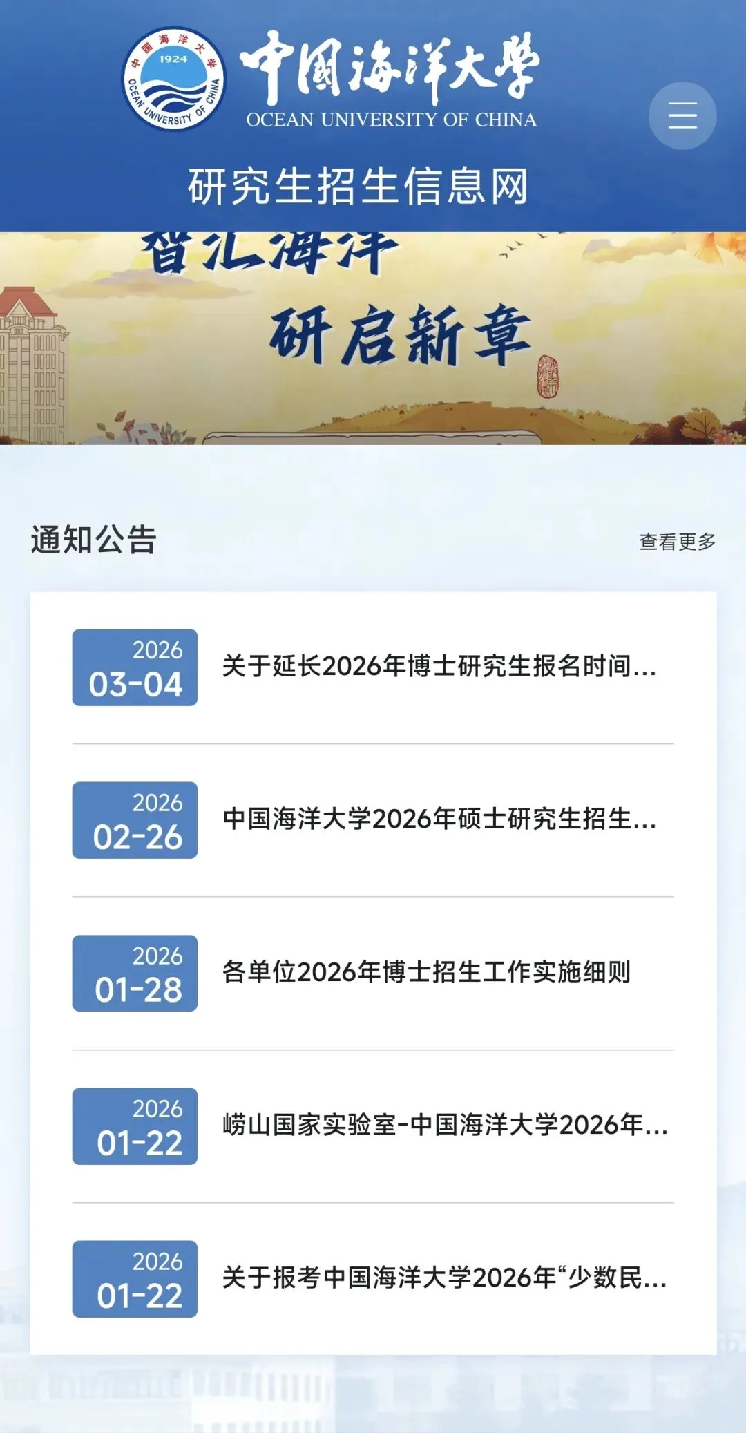 中国海洋大学关于招收研究生的所有通知都会放在这个网站上,像招生简章、报名、录取情况、调剂信息等都会在这个网站上通知。