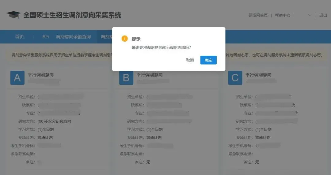 在查询调剂意向之后,提交意向志愿之前,要查看招生单位的申请条件,确认符合之后再提交意向志愿。调剂意向志愿提交后,不可修改、不可取消,每一位考生最多可填10个调剂意向。确认之后,提交即可。等待正式调剂系统开启后的(4月8日)24小时内(超过24小时采集系统将关闭),将“购物车”(预采集系统)中选好的学校,选其中1-3个满足条件的意向志愿“一键转正,转为正式调剂志愿即可。意向志愿≠正式志愿,如果不填,调剂系统开启重新填写提交也是可以的。或者说,填了调剂意向采集,也可以不转正任何意向志愿,直接填正式调剂系统也可以。转正的决定权在你的手里,系统不会自动转正。转为调剂志愿后,页面下方会显示“已转为调剂志愿”,招生单位可以在调剂服务系统后台查询到相应的志愿信息。转为调剂志愿后,左上角会显示“已能被招生单位查询”,招生单位可以在调剂服务系统后台查询到相应的志愿信息。还有同学会问说:那我填写了信息,被填的学校会不会看到我在申请他们学校的调剂啊?当然可以看到啦!因为研招网这个意向采集系统有沟通保障能达到“提前预选,双向沟通”这个目的呢。看到有高校开放意向采集申请入口,在意向采集系统填写之后,考生可以和招生单位预先联系,如果能够得到相对肯定的回复,等正式系统开启之后,填写正式志愿收到复试通知的可能性就大一些。了解完这些调剂必须事项后,小新再为大家带来几条调剂经验!大家虽然都是调剂,但状况也各不相同,大体上有这么几种类型:如果你的分数没能进入一志愿院校报考专业的复试,而恰好一志愿学校允许校内调剂,那你就可以看看有没有合适的其他专业可以调剂。建议大家找跨度不大的专业,这样复习起来也不会有太大的难度,而且一般来讲调剂的专业也会对考生的专业有所要求,最好是跨度不大的专业。这种情况应该占大多数,如果调剂其他学校,现在最重要的就是搜集信息,包括筛选出合适的目标院校、调剂目标的调剂要求、复试参考书目……锁定调剂目标后,最好先与对方取得沟通,确认好之后再进行复试准备。这种情况理论上要容易一些,尤其是信息搜集、联系导师等都会方便许多,但也不可掉以轻心,如果有复试机会,一定要好好准备专业知识哦!调剂的方法大家基本都晓得,但有两点想要提醒同学们:调剂并不容易,一定不要怕麻烦、不好意思询问,这个阶段信息非常重要,多了解一条信息就可能决定着你上岸的机会。所以社恐的同学们尽量克服一下,有任何不懂的、不确定的信息,询问目标院校的研招办老师大概率都能得到很好的解决,在沟通的过程中保持好的态度,注意礼貌,最后记得感谢对方老师。有的同学为了求稳,联系好几所学校,但一定合理安排时间,确定好自己能够参加复试。点击【阅读原文】