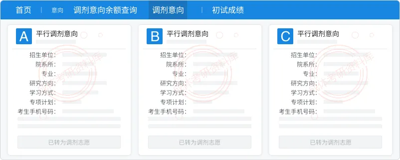 (2)调剂服务系统开通24小时内,在满足条件的前提下,考生可将调剂意向转化为调剂服务系统中的调剂志愿(只能转换3个),已转移成功的调剂志愿与直接在调剂服务系统填报的调剂志愿一样,在招生单位设置的锁定时间内不可取消或更改;未转移成功的调剂意向在调剂服务系统中无效。