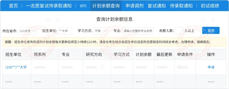 考生在填报调剂志愿前需认真阅读各招生单位在其院校信息栏目里或其他途径发布的调剂办法,查询各招生单位的计划余额信息。