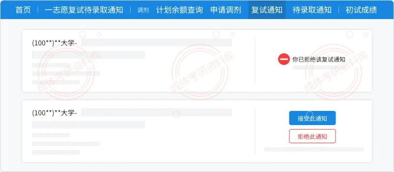 考生提交调剂志愿后,如招生单位同意其参加复试,将通过调剂系统发送复试通知。请考生及时登录调剂系统,查看志愿状态和招生单位复试通知。如果收到复试通知,请考生及时通过调剂系统在招生单位规定时间内回复是否同意参加复试,并按招生单位要求办理相关手续。