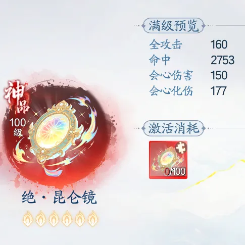 (2)新赛季奖励更新:新赛季新增神品秘宝【绝·昆仑镜】,3月17日新赛季第一轮开启后可在「昆仑商店」使用昆仑贝玉进行兑换。