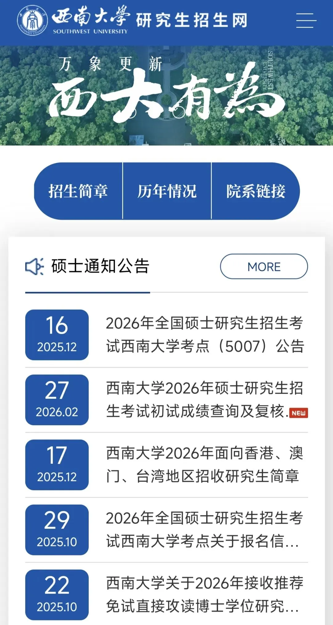西南大学关于招收研究生的所有通知都会放在这个网站上,像招生简章、报名、录取情况、调剂信息等都会在这个网站上通知。