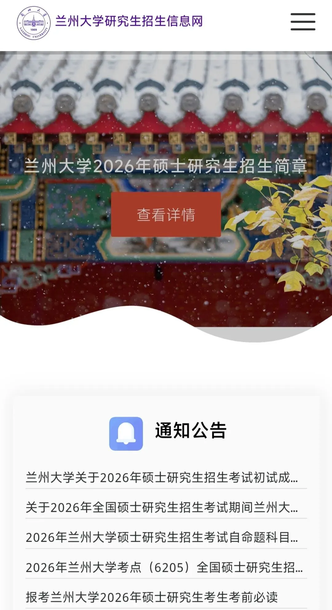 兰州大学关于招收研究生的所有通知都会放在这个网站上,像招生简章、报名、录取情况、调剂信息等都会在这个网站上通知。