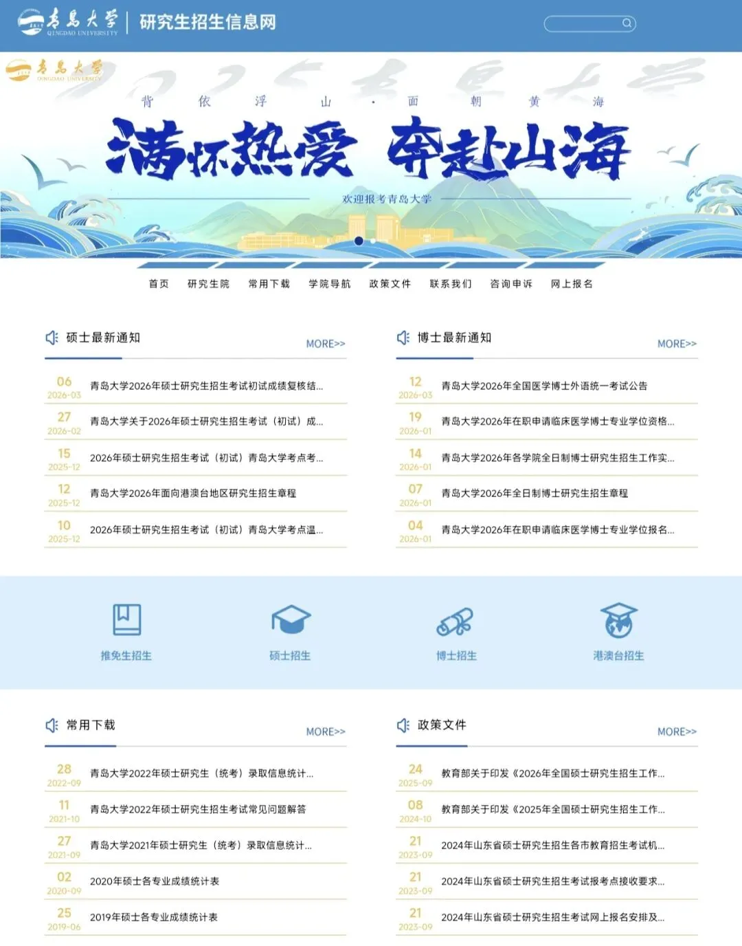 青岛大学关于招收研究生的所有通知都会放在这个网站上,像招生简章、报名、录取情况、调剂信息等都会在这个网站上通知。