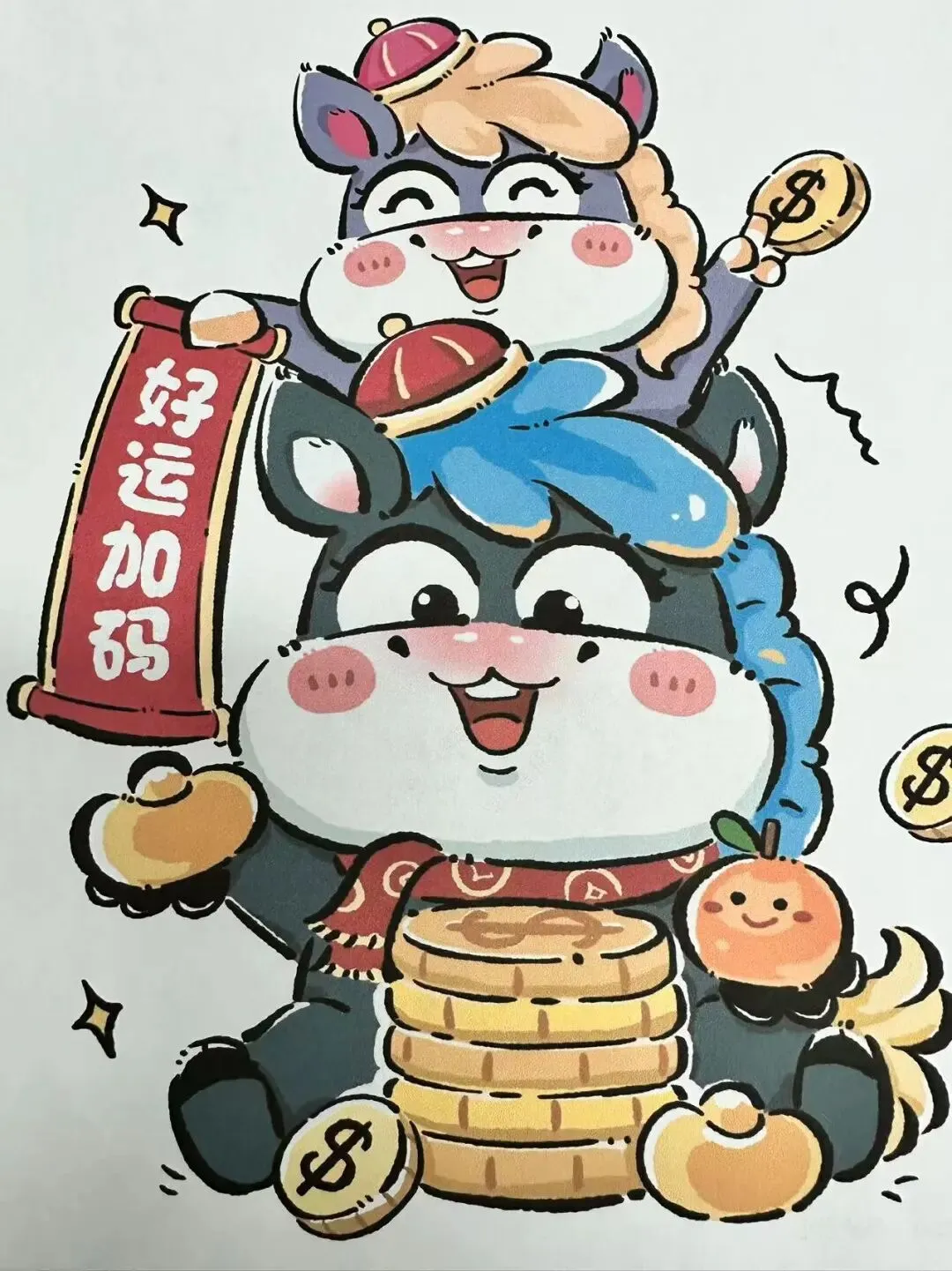 本次以春节传统民俗元素为创作主题,围绕贴马年春联、拜年、迎财神、放鞭炮、收红包等经典年俗场景,完成一套完整的动漫形象表情包设计。