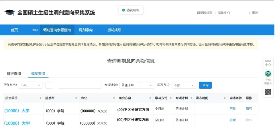 调剂服务系统开通后,采集系统中的“查询调剂意向余额信息”和“填写调剂意向”功能将关闭