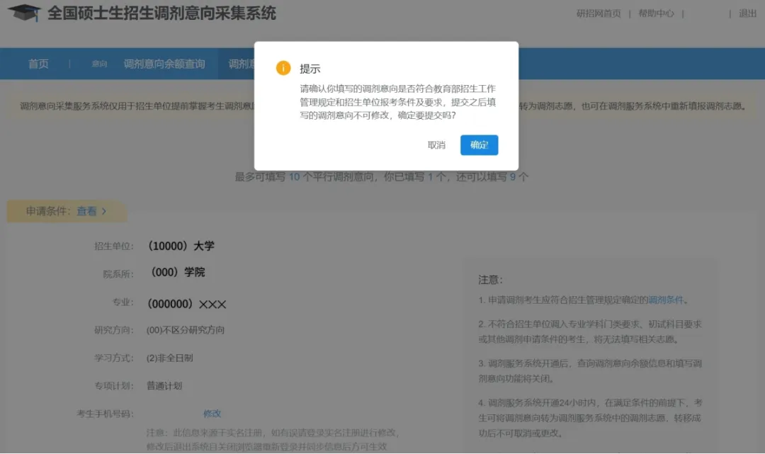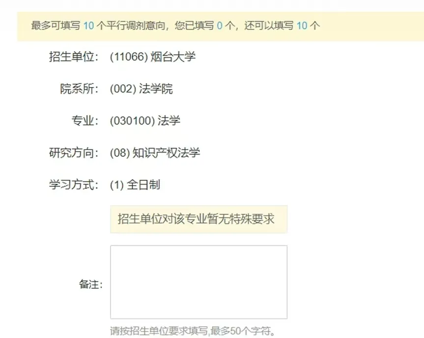 在允许填写调剂意向的时间内,每位考生最多可填写 10个平行调剂意向 ,提交后 不可取消或更改,一定要谨慎操作。