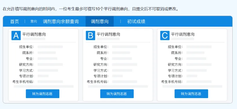 最多可转3 个转成功后,成为正式调剂志愿,在招生单位设置的锁定时间内不可取消或更改- 未转成功的调剂意向在调剂服务系统中无效