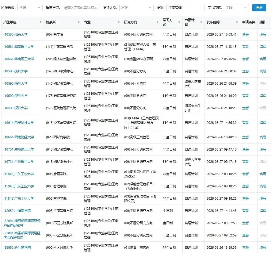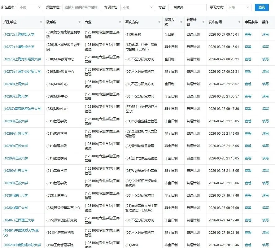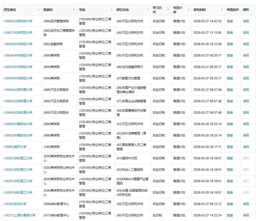 >研招网公布26MBA调剂院校清单