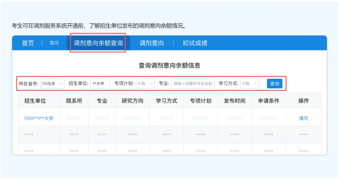 简单来说,就是提前查缺额、填意向,等正式系统开通后,一键把意向转为调剂志愿,省去临时筛选、填报的时间,让你在调剂黄金期快人一步!