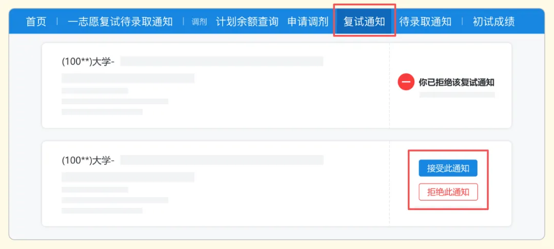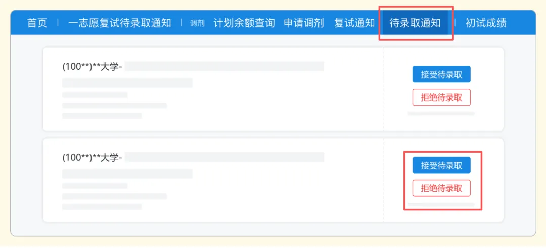 待录取通知只能确认 1 个,确认后即完成调剂,无法再接受其他院校的复试 / 待录取通知;