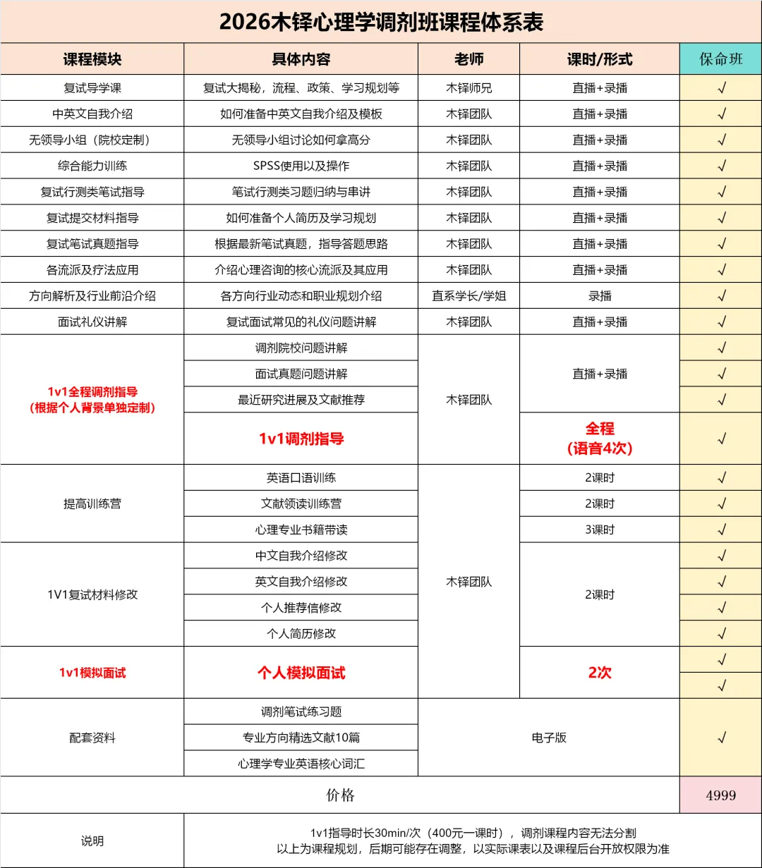 而木铎心理学考研调剂保命班,就是为解决这些痛点而生!我们深知心理学调剂的考察特点和信息差,用专业的指导和针对性的训练,让你在调剂中脱颖而出。专为心理学考研调剂生打造,从 院校筛选、系统填报、复试准备到材料优化 ,全流程手把手指导,让你不用再孤军奋战,打一场有准备的调剂战!覆盖 调剂全流程、英语听力+口语、面试基本礼仪 ,针对心理学调剂复试的考察重点定制内容,轻松解决复试、调剂中的基础问题,快速搭建备考框架。专业老师根据你的 初试成绩、本科院校/专业、学习能力、调剂意向及职业规划 综合评估,出具专属复试调剂评估报告, 推荐3所适配心理学调剂院校 ,并提供院校近两年复试线、调剂人数、调剂分数、报考注意事项等核心数据,告别择校迷茫。从 中英文自我介绍、综合素质考察、英语口语表达到心理学专业技能 ,全方位复刻真实复试场景,单场面试时长约20分钟,结束后给出专业点评和改进建议,让你提前适应复试节奏,消除紧张感。针对复试需要提交的简历、个人陈述等材料,老师一对一指导修改, 深度挖掘你的个人亮点和专业特色 ,展示导师最想看到的内容,让你的材料在众多调剂生中脱颖而出。- 英语口语训练营 :每日心理学专业核心词汇打卡,提供复试英语问题模版,纠正发音,教你如何精准回答复试英语问题;
