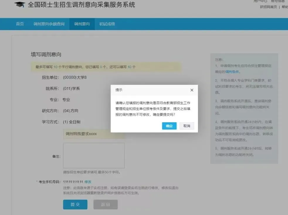 ✅ 10个平行调剂意向提交后,不可取消、不可修改,填报前务必核对院校调剂条件、初试科目要求,慎重选择;