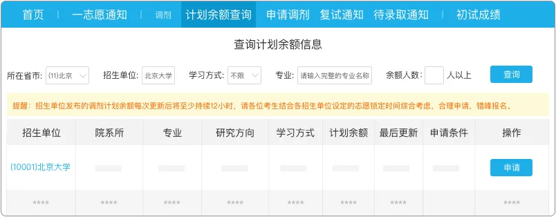 1.认真阅读各招生单位在其院校信息栏目里或其它途径发布的调剂办法,查询各招生单位的计划余额信息。