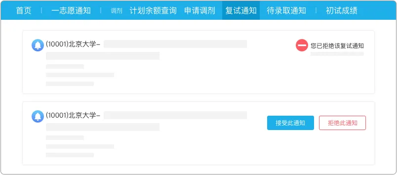 3.招生单位同意参加复试,将通过调剂系统发送复试通知。