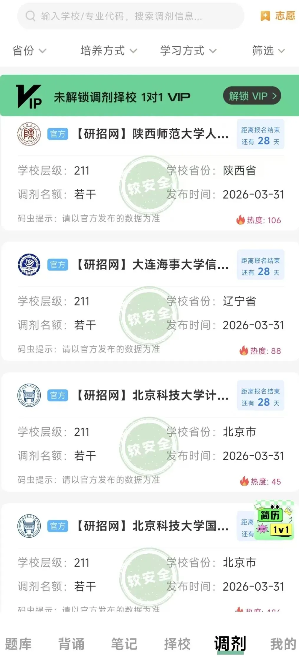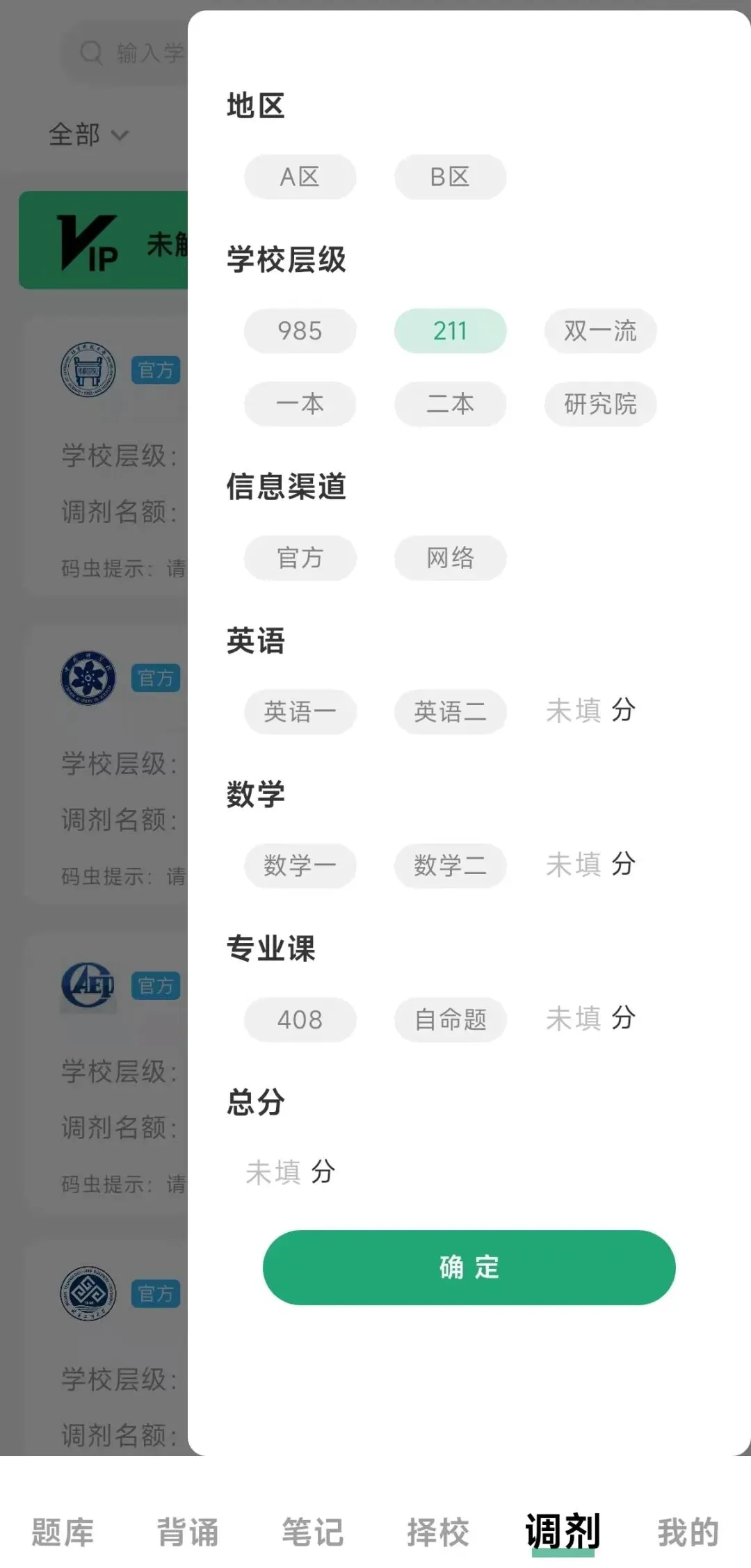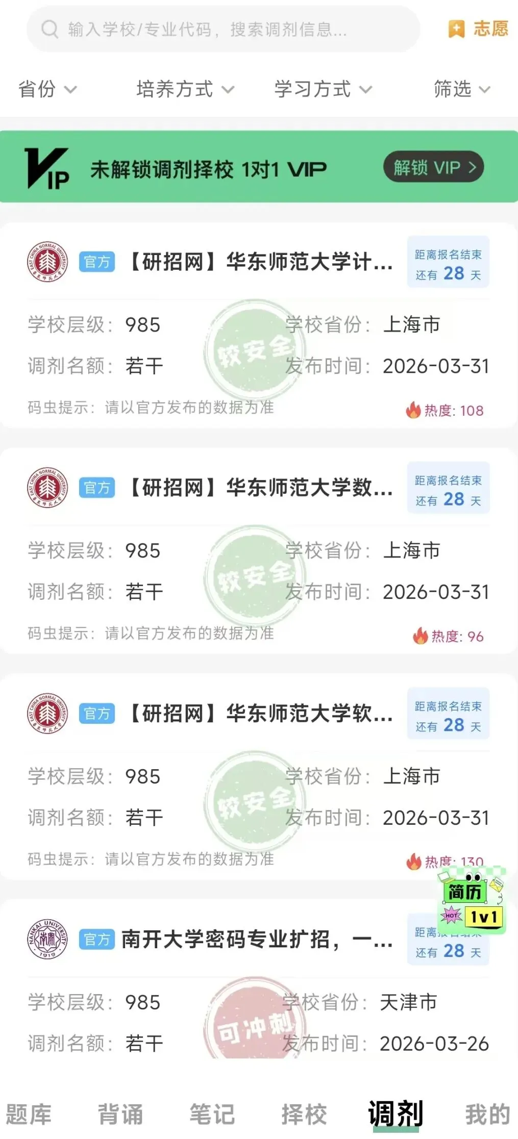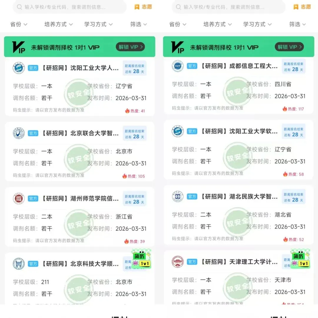 大家可以在码虫刷题app内筛选地区、学校层级等,更快更方便的找到自己想要调剂的院校。