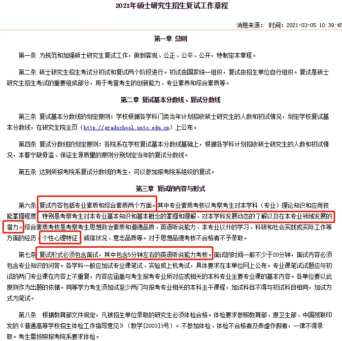 中国科学技术大学发布复试工作章程