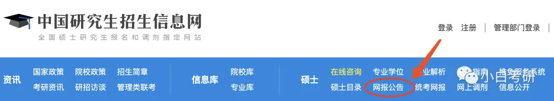 。关于网报公告,除了昨天小白提到的11个省市,今年又有等4个省市发布网报公告,目前累计已有15个省市发布,它们分别是:北京、天津、河北、山西、内蒙古、辽宁、浙江、安徽、福建、湖北、重庆、山东、湖南、陕西、新疆。大家在报名之前,确定一定以及肯定要去看自己报考点(考试所在地,不是报考院校所在地)的网报公告。昨天有不少小小白留言询问不知道怎么查看“网报公告”,今天教大家一下: