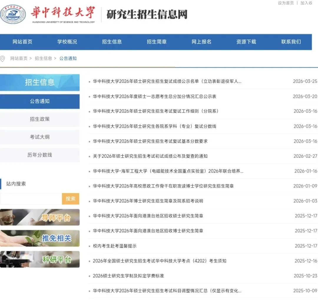 华中科技大学关于招收研究生的所有通知都会放在这个网站上,像招生简章、报名、录取情况、调剂信息等都会在这个网站上通知。