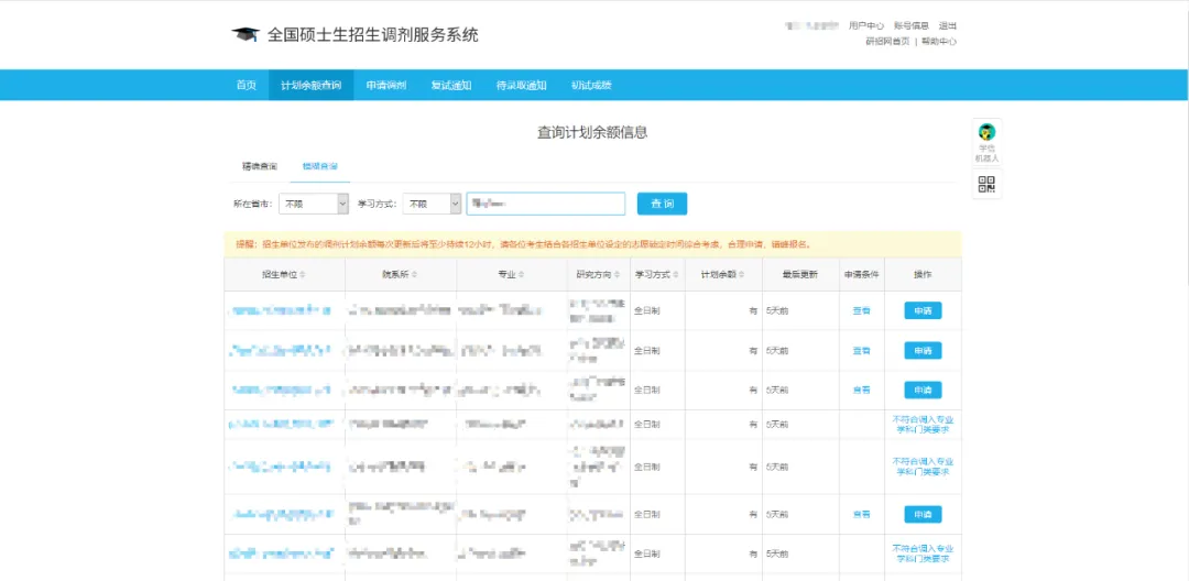 在计划余额查询结果中,选择相应的招生单位、院系所、专业、学习方式以及研究方向,点击“申请”按钮进入申请调剂页面。