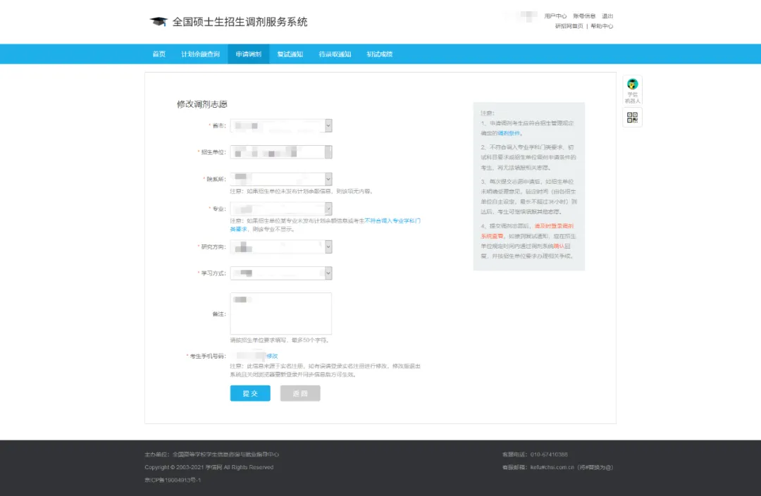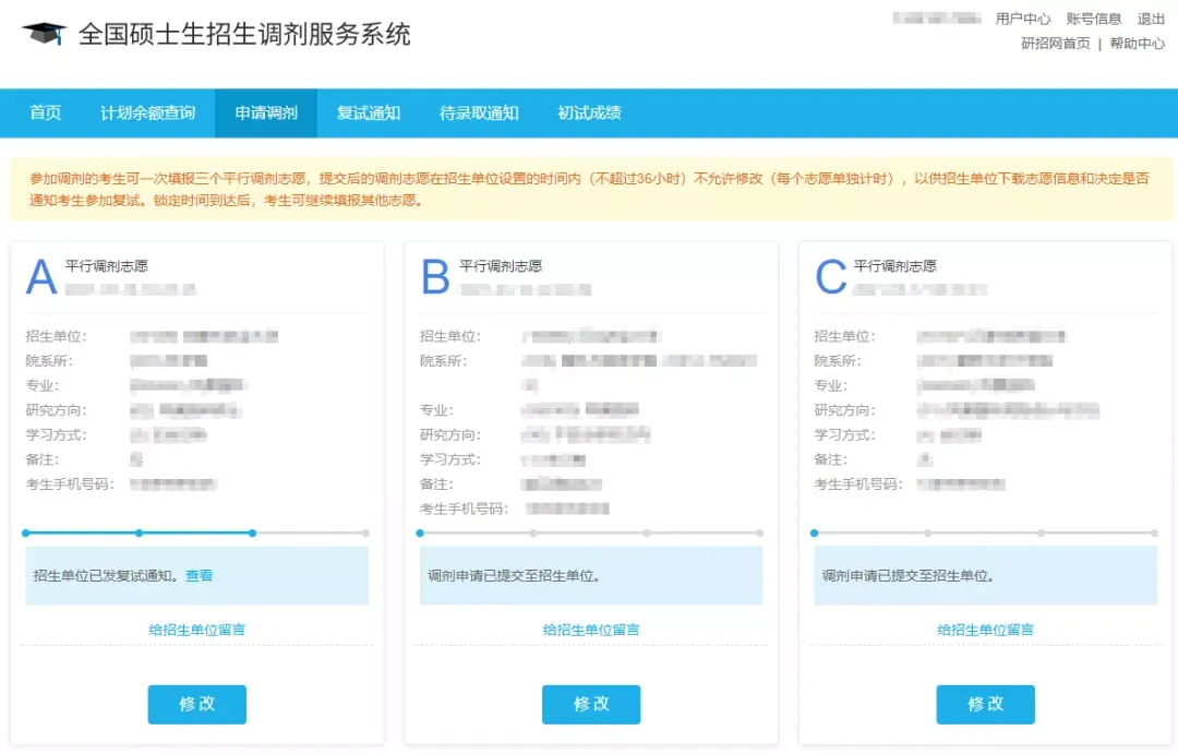 一次可填报三个平行调剂志愿,提交后的调剂志愿在招生单位设置的时间内(不超过36小时)不允许修改(每个志愿单独计时),以供招生单位下载志愿信息和决定是否通知考生参加复试。