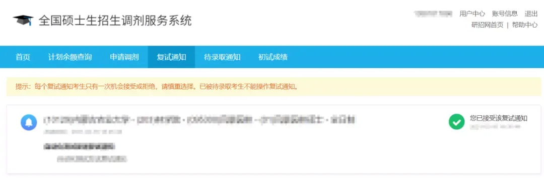 考生只能接受一个调剂志愿的待录取,一旦接受待录取通知,表示调剂完成,将不能再填报调剂志愿、接受复试或待录取通知,慎重选择。