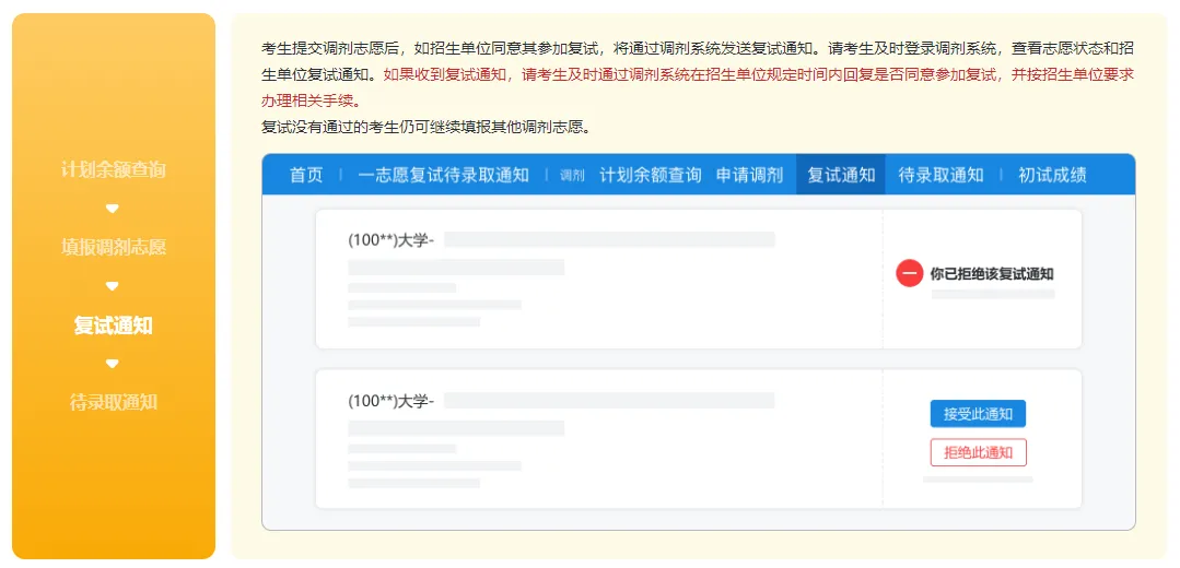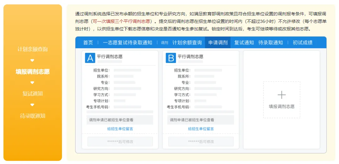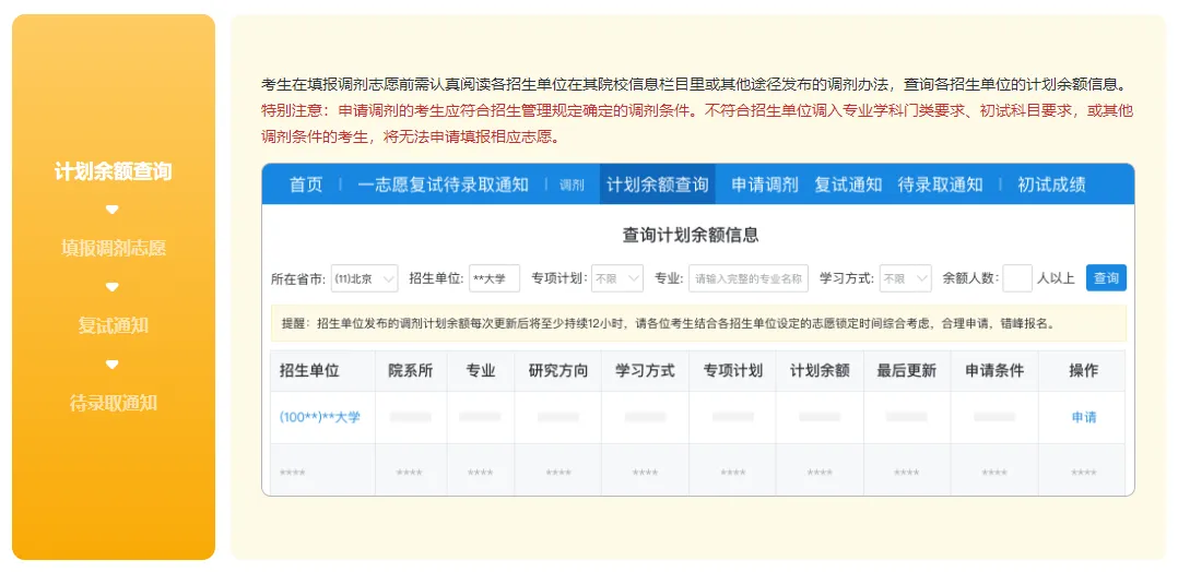 所有调剂考生均须通过该系统完成查询计划余额信息、申请调剂、参加复试、收到待录取通知等环节。