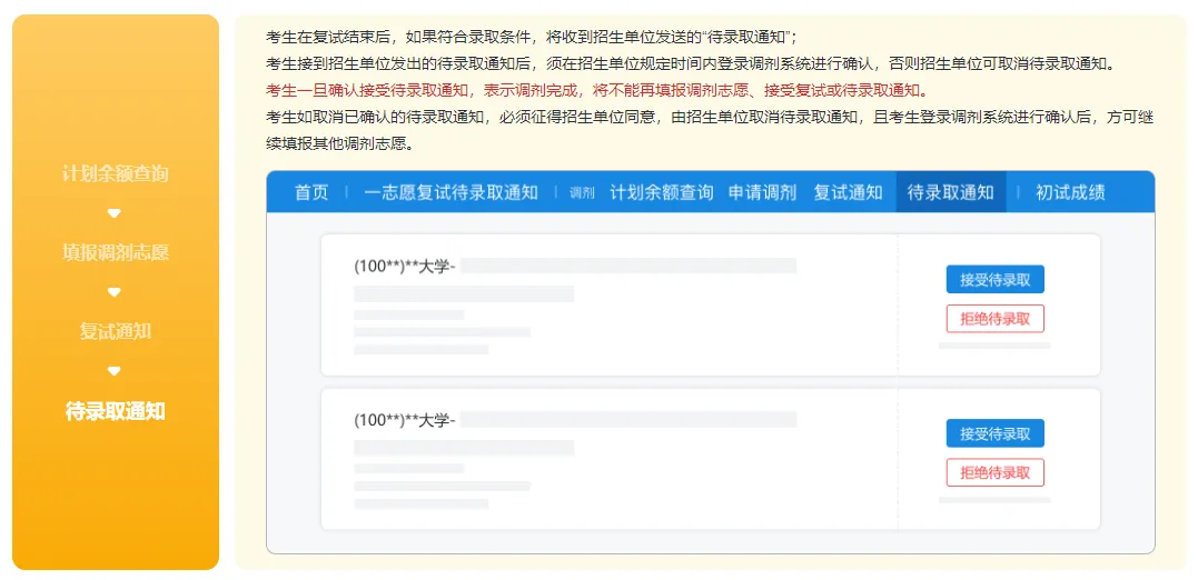 考生一旦确认接受待录取通知,表示调剂完成,将不能再填报调剂志愿、接受复试或待录取通知。