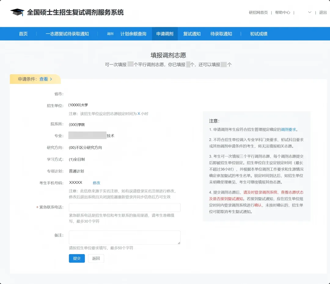 考生在计划余额查询结果中,选择相应招生单位、院系所、专业、研究方向、学习方式等,点击“申请”按钮进入申请调剂页面,参加调剂的考生可一次填报三个平行调剂志愿,提交后的调剂志愿在招生单位设置的时间内(不超过36小时)不允许修改(每个志愿单独计时),以供招生单位下载志愿信息和决定是否通知考生参加复试。锁定时间到达后,考生可继续等待或填报其他志愿。