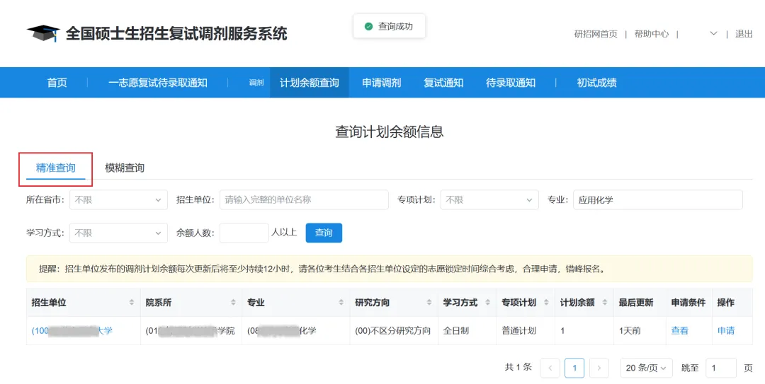 3.查询余额时,若使用精确查询,招生单位、专业至少填写一项;若使用模糊查询,必须选择所在省市与学科专业。