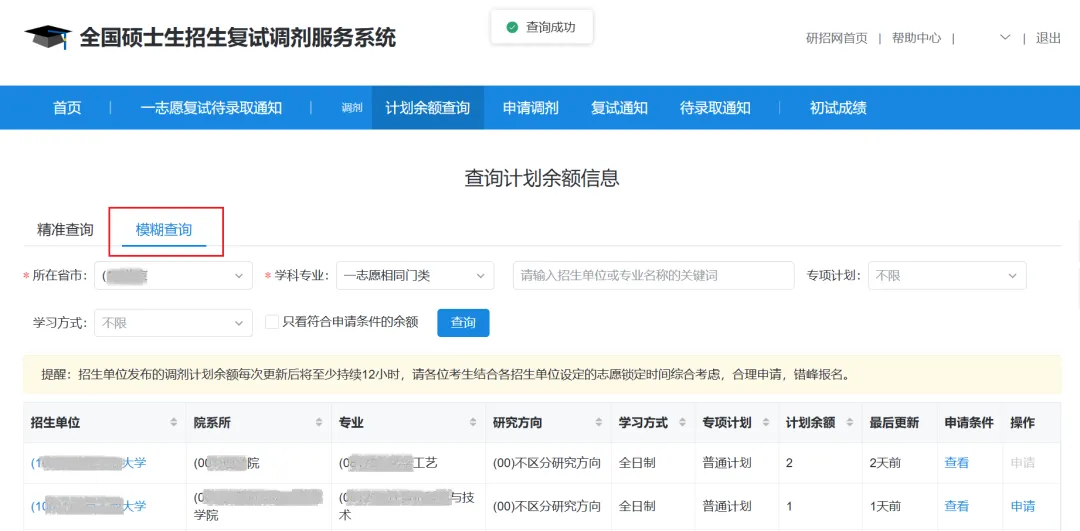 为方便考生查询,考生可在“模糊查询”中按“一志愿相同门类”“一志愿相同学科(类别)”“一志愿相同专业(领域)”筛选,或选择“只看符合申请条件的余额”进行快速查询。