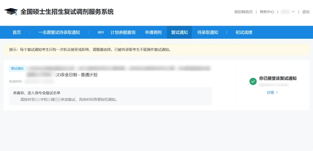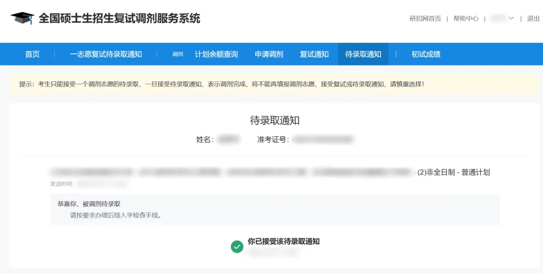 考生只能接受一个调剂志愿的待录取,一旦接受待录取通知,表示调剂完成,将不能再填报调剂志愿、接受复试或待录取通知,请慎重选择!