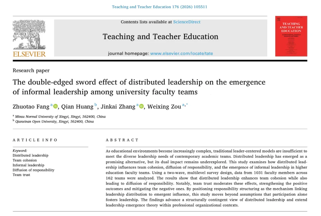 此次发表的论文聚焦高校教师教学团队这一核心群体,以“高校教师教学团队非正式领导力的涌现”为研究主题,深入探讨高校教师教学团队领导力的生成机制与影响路径。论文的第一署名单位是兴义民族师范学院,通讯作者是研究团队负责人邹维兴博士、教授,第一作者是教务处方卓涛博士、副教授。