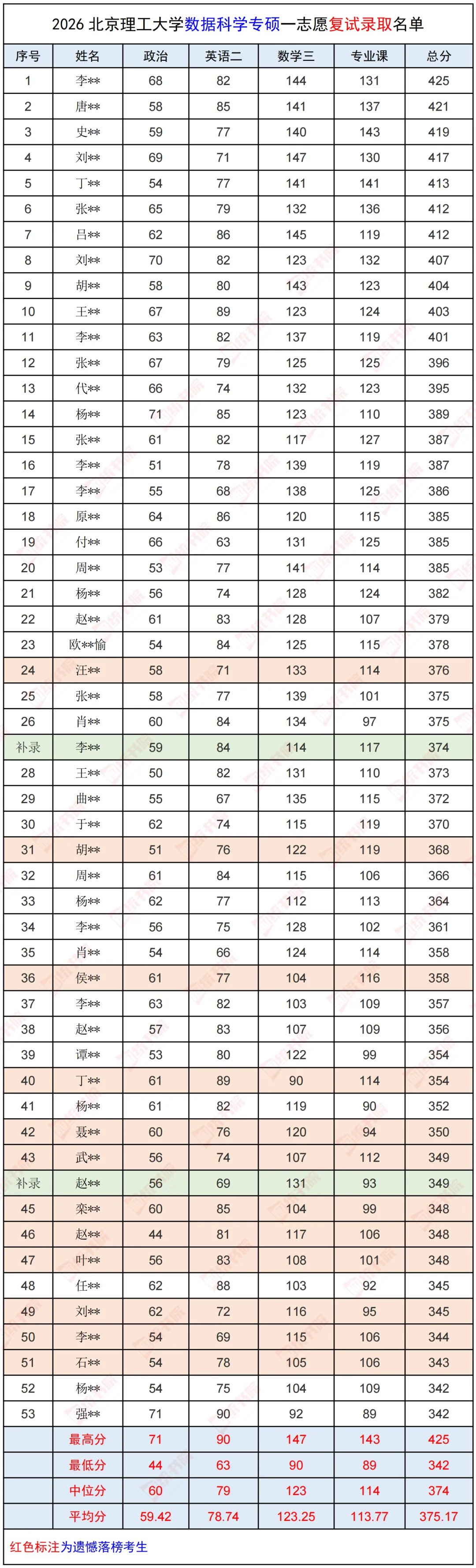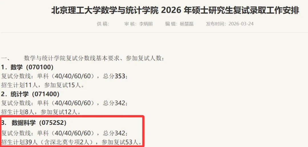 >远远多于研招网的人数!2026北京理工大学数据科学专硕复试线342,拟录取41人